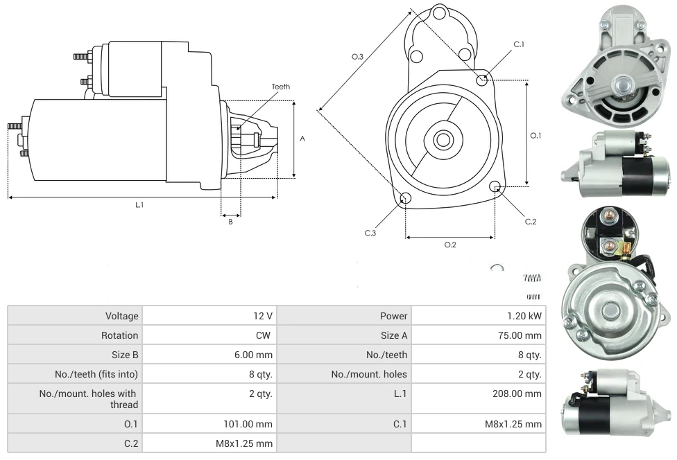 Starters Voltage [ V ] 12 Power [ kW ] 1.20 Rotation CW Size A [ mm ] 75.00 Size B [ mm ] 6.00 No./teeth [ qty. ] 8 No./teeth (fits into) [ qty. ] 8 No./mount. holes [ qty. ] 2 No./mount. holes with thread [ qty. ] 2 L.1 [ mm ] 208.00 O.1 [ mm ] 101.00 C.1 [ mm ] M8x1.25 C.2 [ mm ] M8x1.25