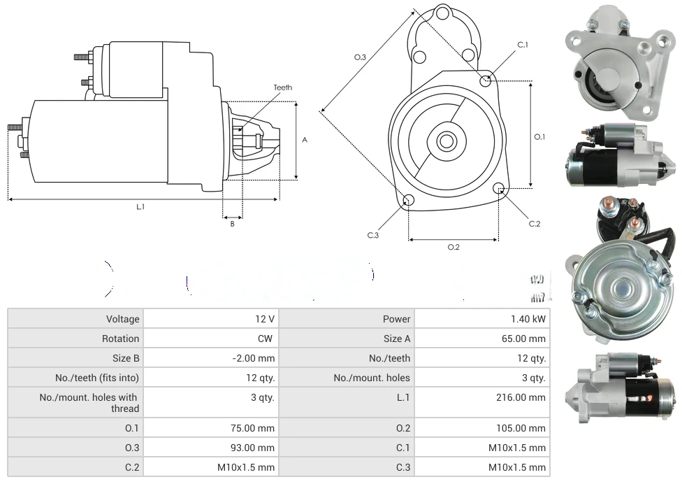 Starters Voltage [ V ] 12 Power [ kW ] 1.70 Rotation CW Size A [ mm ] 65.00 Size B [ mm ] -2.00 No./teeth [ qty. ] 12 No./teeth (fits into) [ qty. ] 12 No./mount. holes [ qty. ] 3 No./mount. holes with thread [ qty. ] 3 L.1 [ mm ] 216.00 O.1 [ mm ] 75.00 O.2 [ mm ] 105.00 O.3 [ mm ] 93.00 C.1 [ mm ] M10x1.5 C.2 [ mm ] M10x1.5 C.3 [ mm ] M10x1.5