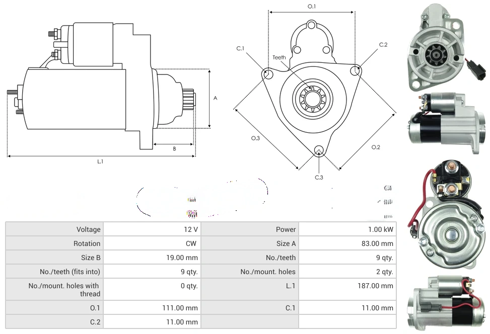 Starters Voltage [ V ] 12 Power [ kW ] 1.20 Rotation CW Size A [ mm ] 83.00 Size B [ mm ] 19.00 No./teeth [ qty. ] 9 No./teeth (fits into) [ qty. ] 9 No./mount. holes [ qty. ] 2 No./mount. holes with thread [ qty. ] 0 L.1 [ mm ] 187.00 O.1 [ mm ] 111.00 C.1 [ mm ] 11.00 C.2 [ mm ] 11.00