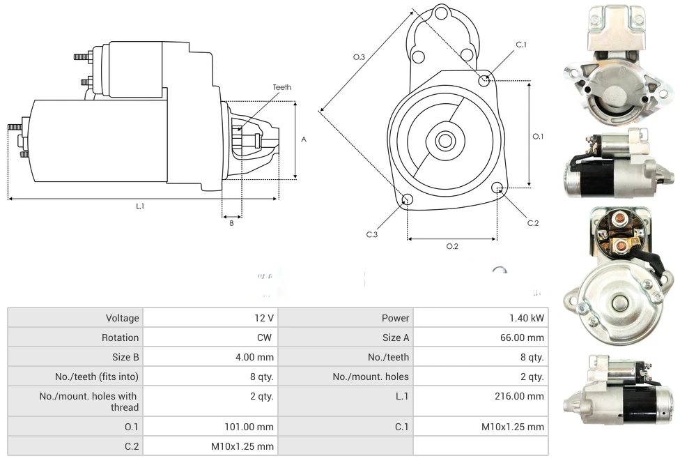 Starters Voltage [ V ] 12 Power [ kW ] 1.40 Rotation CW Size A [ mm ] 66.00 Size B [ mm ] 4.00 No./teeth [ qty. ] 8 No./teeth (fits into) [ qty. ] 8 No./mount. holes [ qty. ] 2 No./mount. holes with thread [ qty. ] 2 L.1 [ mm ] 216.00 O.1 [ mm ] 101.00 C.1 [ mm ] M10x1.25 C.2 [ mm ] M10x1.25