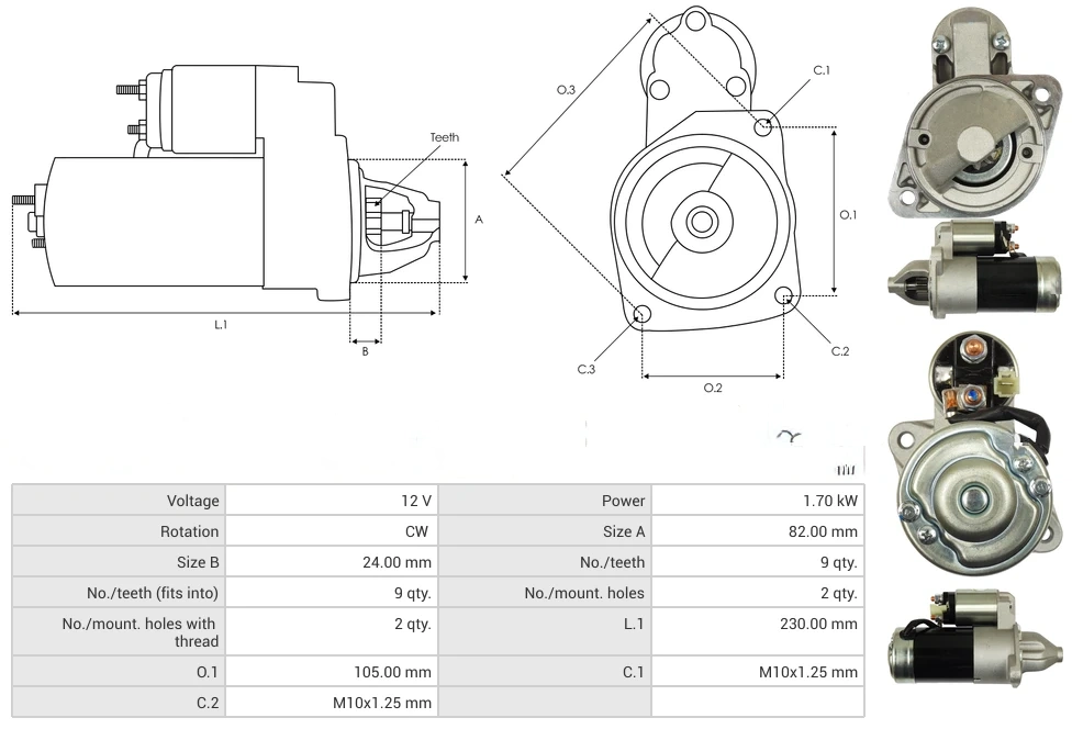 Starters Voltage [ V ] 12 Power [ kW ] 1.70 Rotation CW Size A [ mm ] 82.00 Size B [ mm ] 24.00 No./teeth [ qty. ] 9 No./teeth (fits into) [ qty. ] 9 No./mount. holes [ qty. ] 2 No./mount. holes with thread [ qty. ] 2 L.1 [ mm ] 230.00 O.1 [ mm ] 105.00 C.1 [ mm ] M10x1.25 C.2 [ mm ] M10x1.25