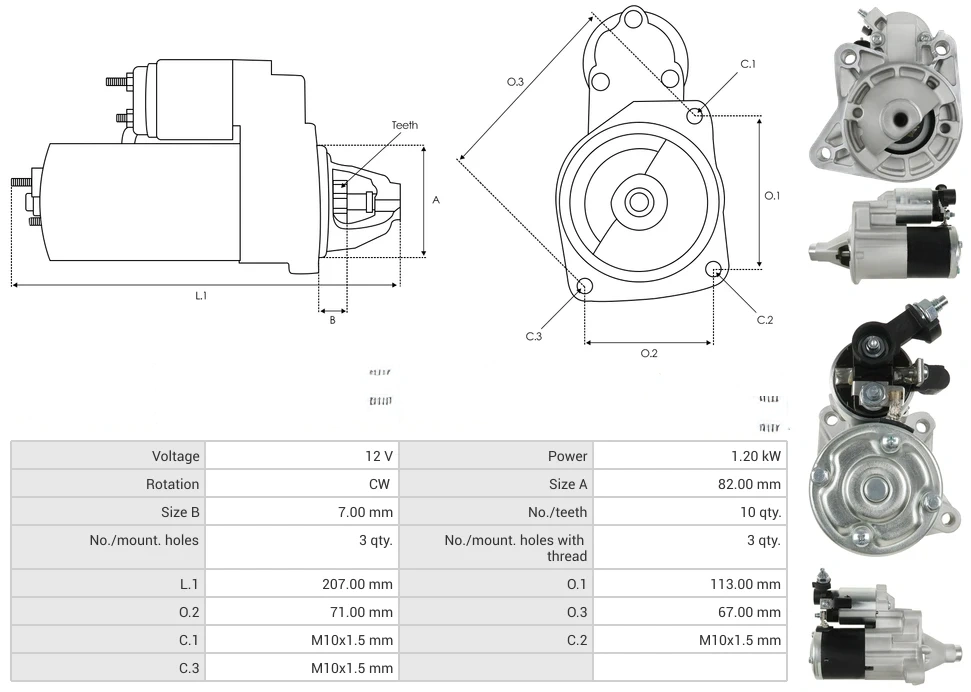 Starters Voltage [ V ] 12 Power [ kW ] 1.20 Rotation CW Size A [ mm ] 82.00 Size B [ mm ] 7.00 No./teeth [ qty. ] 10 No./mount. holes [ qty. ] 3 No./mount. holes with thread [ qty. ] 3 L.1 [ mm ] 207.00 O.1 [ mm ] 113.00 O.2 [ mm ] 71.00 O.3 [ mm ] 67.00 C.1 [ mm ] M10x1.5 C.2 [ mm ] M10x1.5 C.3 [ mm ] M10x1.5
