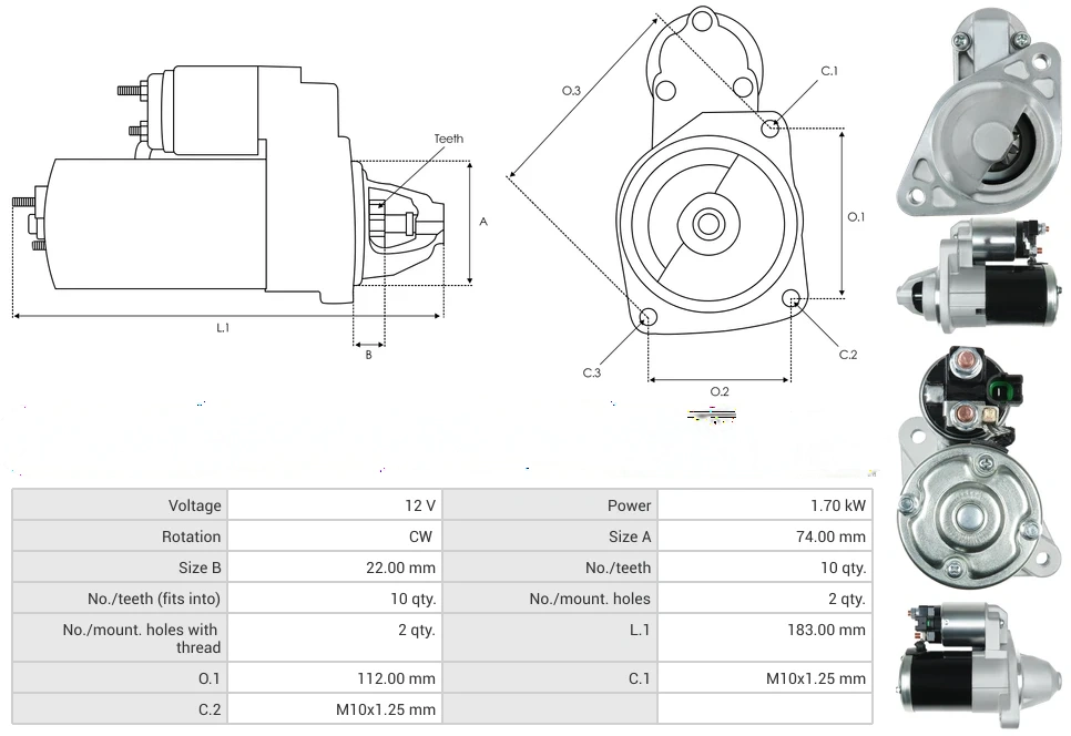 Starters Voltage [ V ] 12 Power [ kW ] 1.70 Rotation CW Size A [ mm ] 74.00 Size B [ mm ] 22.00 No./teeth [ qty. ] 10 No./teeth (fits into) [ qty. ] 10 No./mount. holes [ qty. ] 2 No./mount. holes with thread [ qty. ] 2 L.1 [ mm ] 183.00 O.1 [ mm ] 112.00 C.1 [ mm ] M10x1.25 C.2 [ mm ] M10x1.25