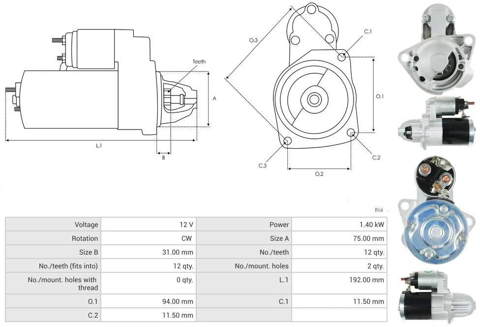 Starters Voltage [ V ] 12 Power [ kW ] 1.40 Rotation CW Size A [ mm ] 75.00 Size B [ mm ] 31.00 No./teeth [ qty. ] 12 No./teeth (fits into) [ qty. ] 12 No./mount. holes [ qty. ] 2 No./mount. holes with thread [ qty. ] 0 L.1 [ mm ] 192.00 O.1 [ mm ] 94.00 C.1 [ mm ] 11.50 C.2 [ mm ] 11.50