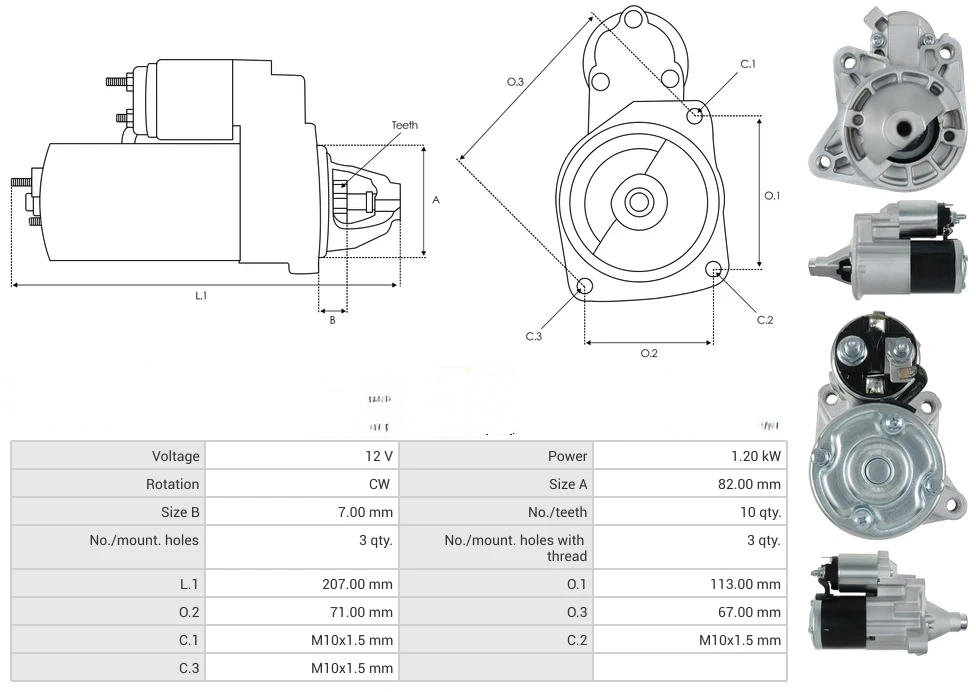 Starters Voltage [ V ] 12 Power [ kW ] 1.20 Rotation CW Size A [ mm ] 82.00 Size B [ mm ] 7.00 No./teeth [ qty. ] 10 No./mount. holes [ qty. ] 3 No./mount. holes with thread [ qty. ] 3 L.1 [ mm ] 207.00 O.1 [ mm ] 113.00 O.2 [ mm ] 71.00 O.3 [ mm ] 67.00 C.1 [ mm ] M10x1.5 C.2 [ mm ] M10x1.5 C.3 [ mm ] M10x1.5
