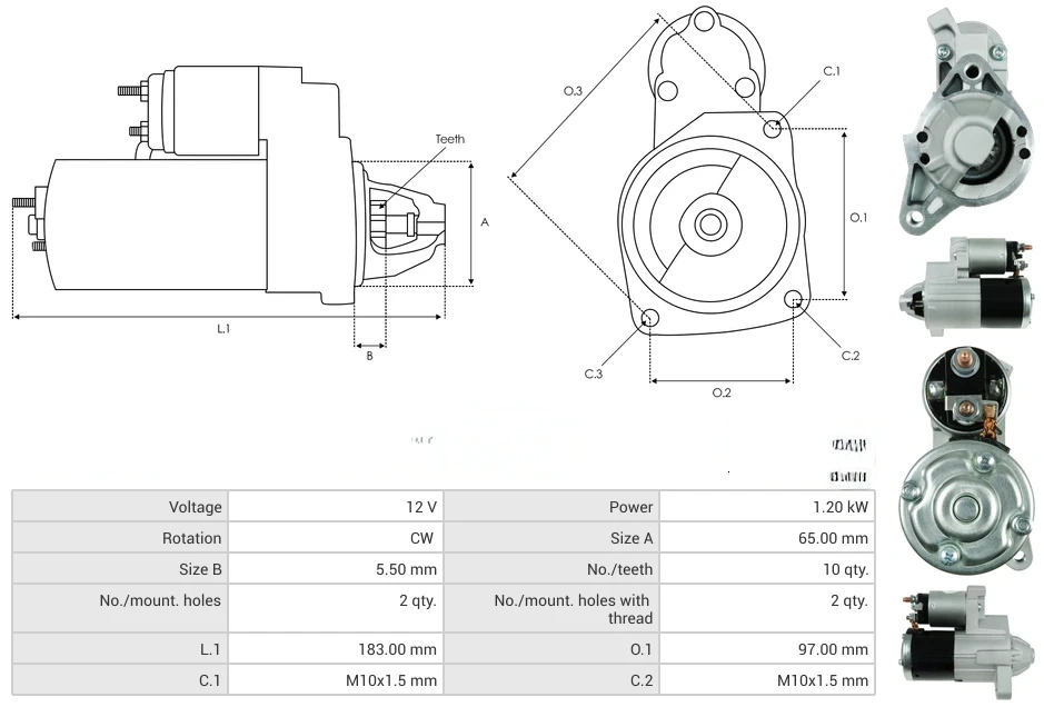 Starters Voltage [ V ] 12 Power [ kW ] 1.20 Rotation CW Size A [ mm ] 65.00 Size B [ mm ] 5.50 No./teeth [ qty. ] 10 No./mount. holes [ qty. ] 2 No./mount. holes with thread [ qty. ] 2 L.1 [ mm ] 183.00 O.1 [ mm ] 97.00 C.1 [ mm ] M10x1.5 C.2 [ mm ] M10x1.5