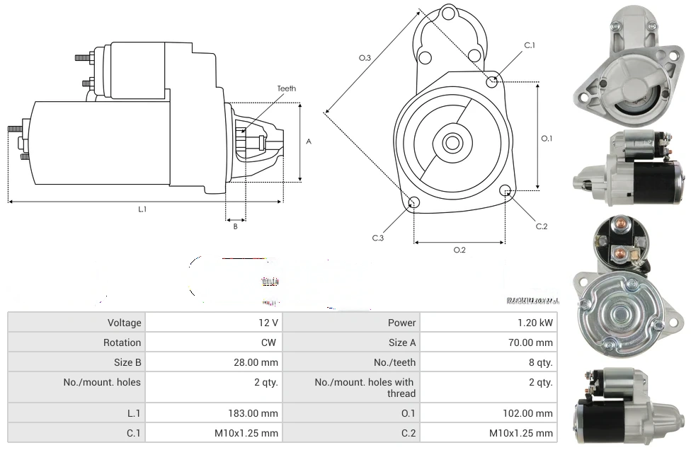 Starters Voltage [ V ] 12 Power [ kW ] 1.20 Rotation CW Size A [ mm ] 70.00 Size B [ mm ] 28.00 No./teeth [ qty. ] 8 No./mount. holes [ qty. ] 2 No./mount. holes with thread [ qty. ] 2 L.1 [ mm ] 183.00 O.1 [ mm ] 102.00 C.1 [ mm ] M10x1.25 C.2 [ mm ] M10x1.25