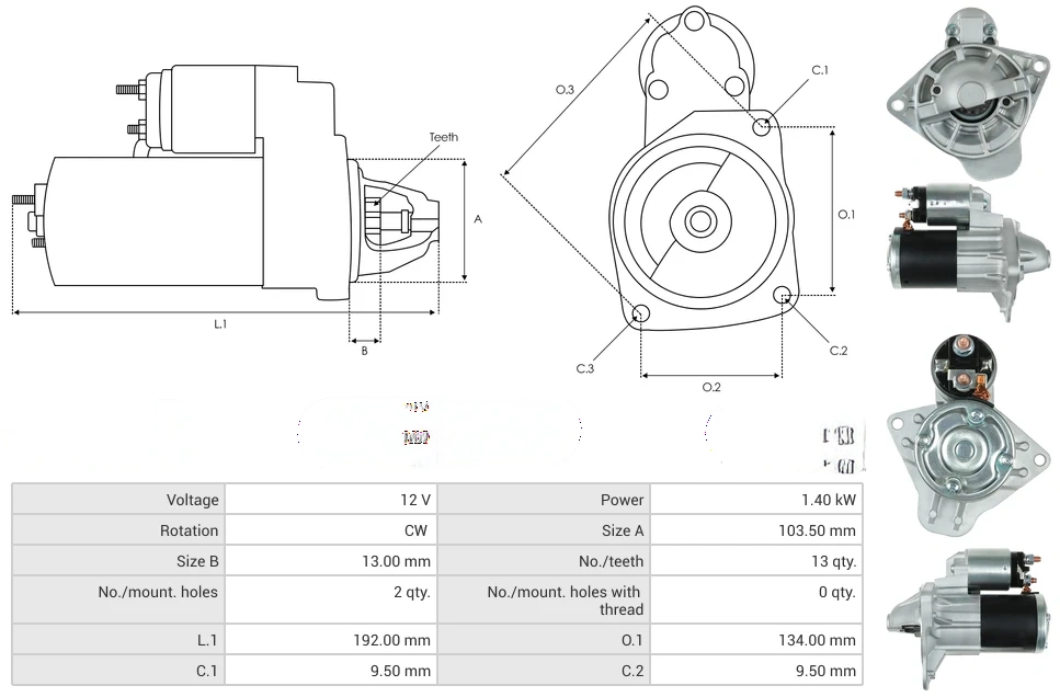 Starters Voltage [ V ] 12 Power [ kW ] 1.40 Rotation CW Size A [ mm ] 103.50 Size B [ mm ] 13.00 No./teeth [ qty. ] 13 No./mount. holes [ qty. ] 2 No./mount. holes with thread [ qty. ] 0 L.1 [ mm ] 192.00 O.1 [ mm ] 134.00 C.1 [ mm ] 9.50 C.2 [ mm ] 9.50