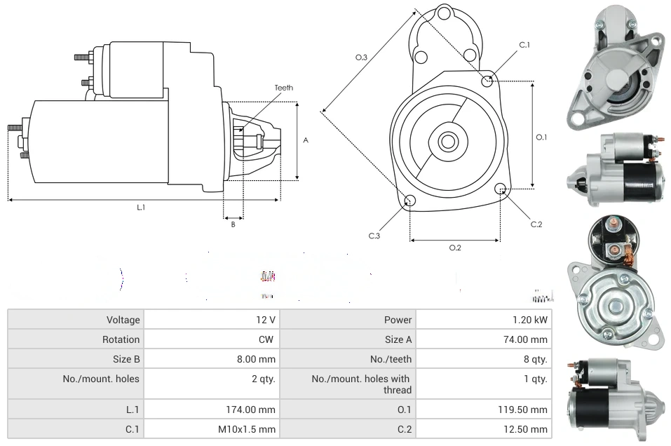 Starters Voltage [ V ] 12 Power [ kW ] 1.20 Rotation CW Size A [ mm ] 74.00 Size B [ mm ] 8.00 No./teeth [ qty. ] 8 No./mount. holes [ qty. ] 2 No./mount. holes with thread [ qty. ] 1 L.1 [ mm ] 174.00 O.1 [ mm ] 119.50 C.1 [ mm ] M10x1.5 C.2 [ mm ] 12.50