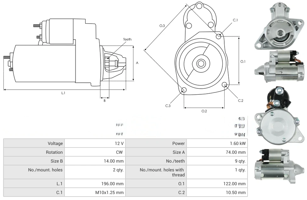 Starters Voltage [ V ] 12 Power [ kW ] 1.60 Rotation CW Size A [ mm ] 74.00 Size B [ mm ] 14.00 No./teeth [ qty. ] 9 No./mount. holes [ qty. ] 2 No./mount. holes with thread [ qty. ] 1 L.1 [ mm ] 196.00 O.1 [ mm ] 122.00 C.1 [ mm ] M10x1.25 C.2 [ mm ] 10.50