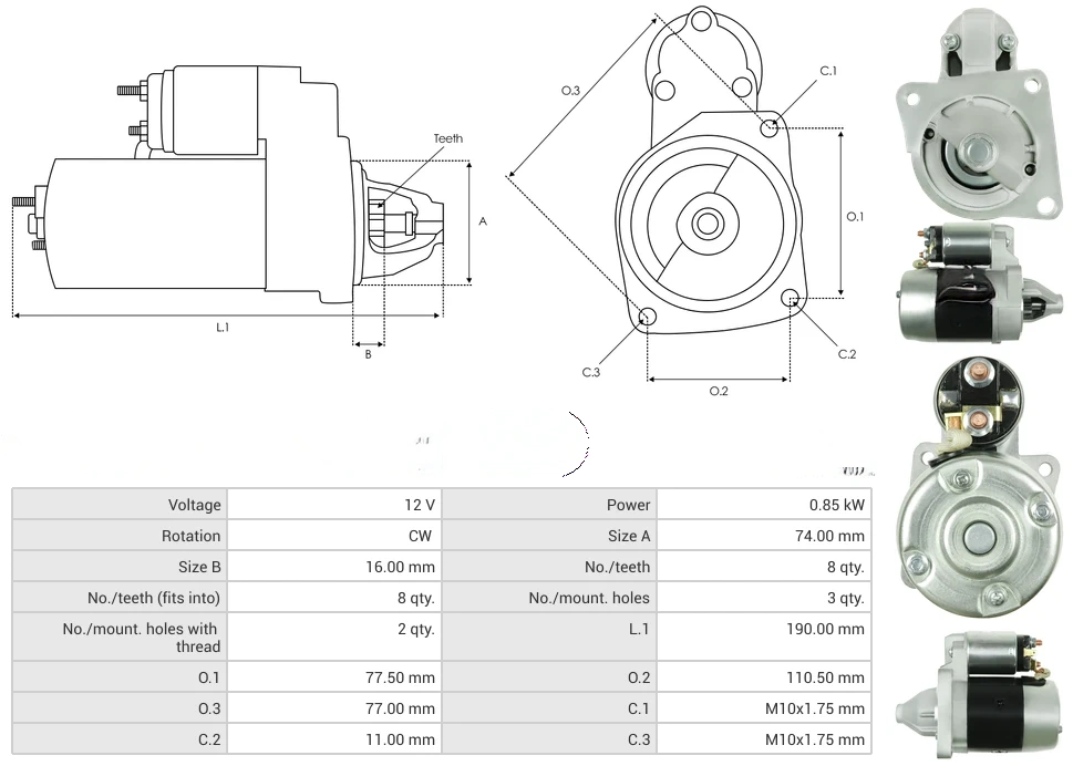 Starters Voltage [ V ] 12 Power [ kW ] 0.85 Rotation CW Size A [ mm ] 74.00 Size B [ mm ] 16.00 No./teeth [ qty. ] 8 No./teeth (fits into) [ qty. ] 8 No./mount. holes [ qty. ] 3 No./mount. holes with thread [ qty. ] 2 L.1 [ mm ] 190.00 O.1 [ mm ] 77.50 O.2 [ mm ] 110.50 O.3 [ mm ] 77.00 C.1 [ mm ] M10x1.75 C.2 [ mm ] 11.00 C.3 [ mm ] M10x1.75