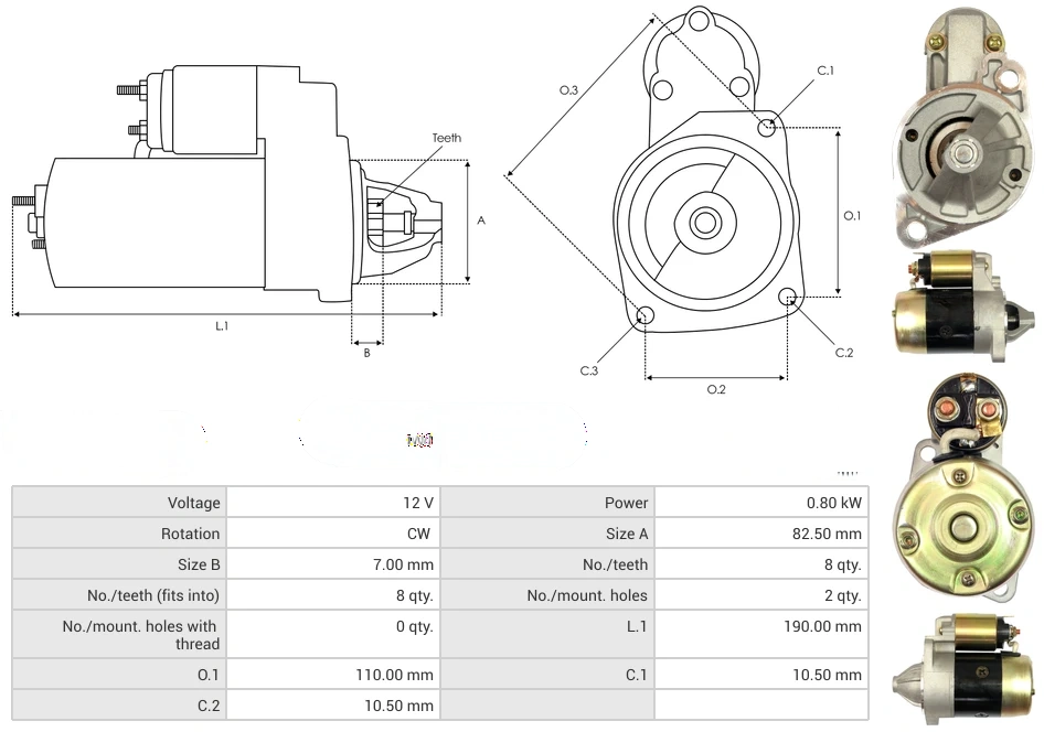 Starters Voltage [ V ] 12 Power [ kW ] 0.80 Rotation CW Size A [ mm ] 82.50 Size B [ mm ] 7.00 No./teeth [ qty. ] 8 No./teeth (fits into) [ qty. ] 8 No./mount. holes [ qty. ] 2 No./mount. holes with thread [ qty. ] 0 L.1 [ mm ] 190.00 O.1 [ mm ] 110.00 C.1 [ mm ] 10.50 C.2 [ mm ] 10.50