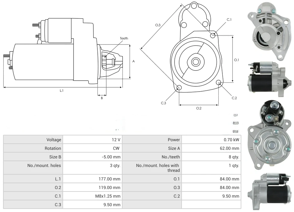 Starters Voltage [ V ] 12 Power [ kW ] 0.70 Rotation CW Size A [ mm ] 62.00 Size B [ mm ] -5.00 No./teeth [ qty. ] 8 No./mount. holes [ qty. ] 3 No./mount. holes with thread [ qty. ] 1 L.1 [ mm ] 177.00 O.1 [ mm ] 84.00 O.2 [ mm ] 119.00 O.3 [ mm ] 84.00 C.1 [ mm ] M8x1.25 C.2 [ mm ] 9.50 C.3 [ mm ] 9.50