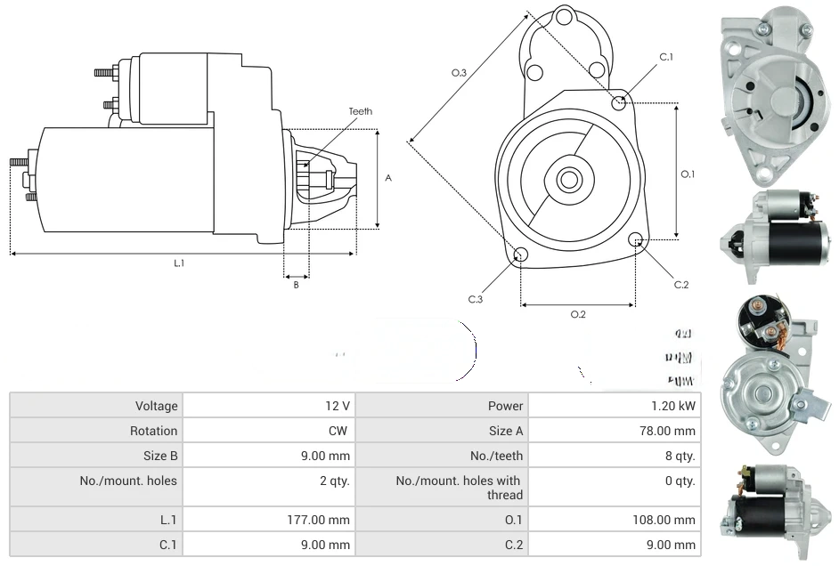 Starters Voltage [ V ] 12 Power [ kW ] 1.20 Rotation CW Size A [ mm ] 78.00 Size B [ mm ] 9.00 No./teeth [ qty. ] 8 No./mount. holes [ qty. ] 2 No./mount. holes with thread [ qty. ] 0 L.1 [ mm ] 177.00 O.1 [ mm ] 108.00 C.1 [ mm ] 9.00 C.2 [ mm ] 9.00