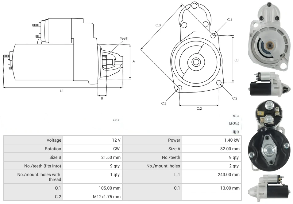 Starters Voltage [ V ] 12 Power [ kW ] 1.40 Rotation CW Size A [ mm ] 82.00 Size B [ mm ] 21.50 No./teeth [ qty. ] 9 No./teeth (fits into) [ qty. ] 9 No./mount. holes [ qty. ] 2 No./mount. holes with thread [ qty. ] 1 L.1 [ mm ] 243.00 O.1 [ mm ] 105.00 C.1 [ mm ] 13.00 C.2 [ mm ] M12x1.75