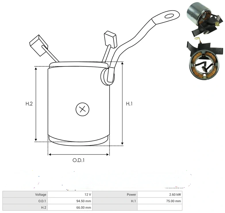 Starter yokes with field coils Voltage [ V ] 12 Power [ kW ] 2.60 O.D.1 [ mm ] 94.50 H.1 [ mm ] 75.00 H.2 [ mm ] 66.00