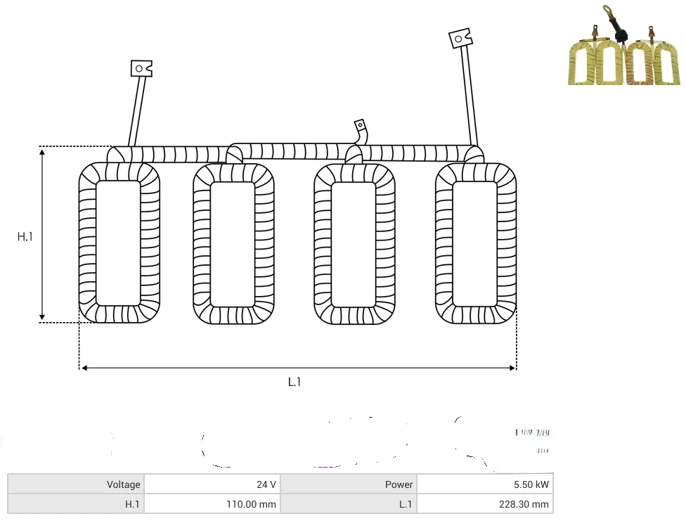 Starter field coils Voltage [ V ] 24 Power [ kW ] 5.50 H.1 [ mm ] 110.00 L.1 [ mm ] 228.30