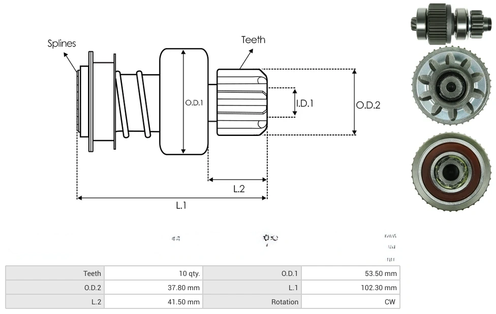 Starter drives Teeth [ qty. ] 10 O.D.1 [ mm ] 53.50 O.D.2 [ mm ] 37.80 L.1 [ mm ] 102.30 L.2 [ mm ] 41.50 Rotation CW