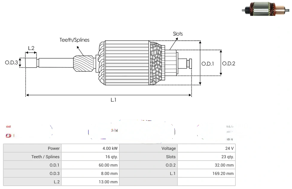 Starter armatures Power [ kW ] 4.00 Voltage [ V ] 24 Teeth / Splines [ qty. ] 16 Slots [ qty. ] 23 O.D.1 [ mm ] 60.00 O.D.2 [ mm ] 32.00 O.D.3 [ mm ] 8.00 L.1 [ mm ] 169.20 L.2 [ mm ] 13.00