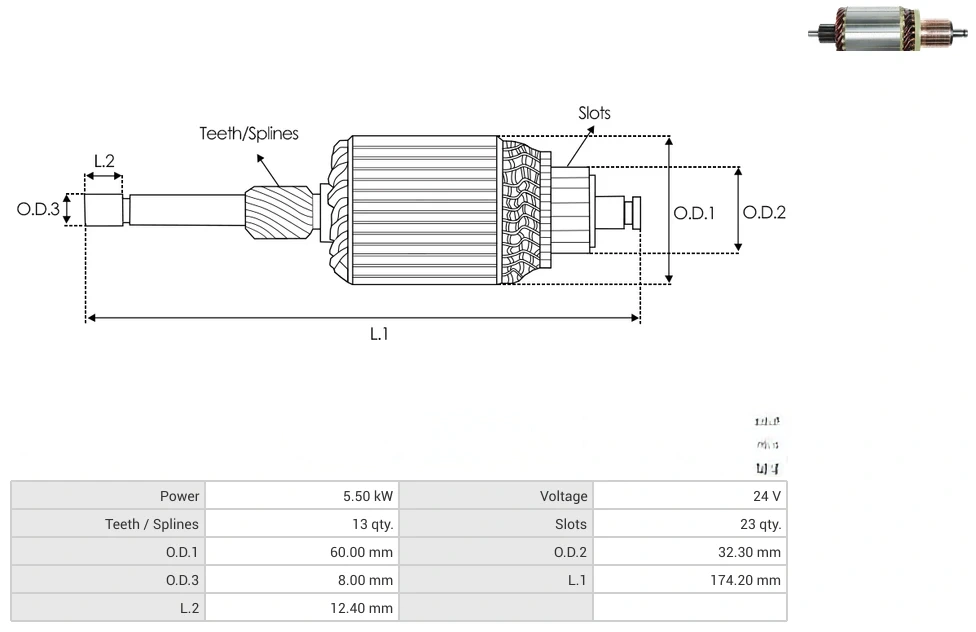 Starter armatures Power [ kW ] 5.50 Voltage [ V ] 24 Teeth / Splines [ qty. ] 13 Slots [ qty. ] 23 O.D.1 [ mm ] 60.00 O.D.2 [ mm ] 32.30 O.D.3 [ mm ] 8.00 L.1 [ mm ] 174.20 L.2 [ mm ] 12.40