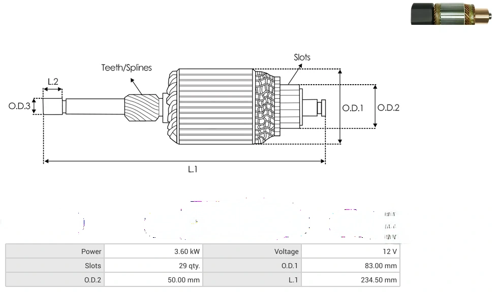 Starter armatures Power [ kW ] 3.60 Voltage [ V ] 12 Slots [ qty. ] 29 O.D.1 [ mm ] 83.00 O.D.2 [ mm ] 50.00 L.1 [ mm ] 234.50