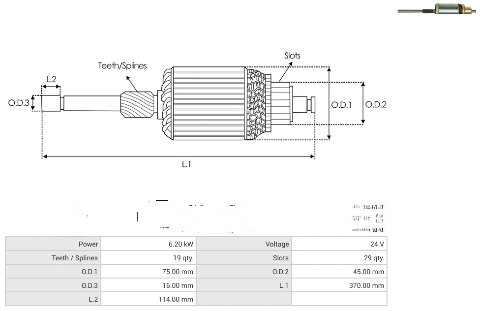 Starter armatures Power [ kW ] 6.20 Voltage [ V ] 24 Teeth / Splines [ qty. ] 19 Slots [ qty. ] 29 O.D.1 [ mm ] 75.00 O.D.2 [ mm ] 45.00 O.D.3 [ mm ] 16.00 L.1 [ mm ] 370.00 L.2 [ mm ] 114.00
