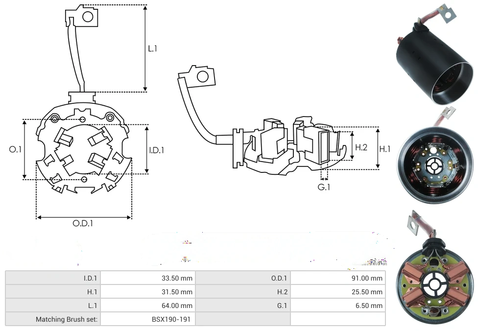 Starter brush holders I.D.1 [ mm ] 33.50 O.D.1 [ mm ] 91.00 H.1 [ mm ] 31.50 H.2 [ mm ] 25.50 L.1 [ mm ] 64.00 G.1 [ mm ] 6.50 Matching Brush set: BSX190-191 Starter yokes with field coils Voltage [ V ] 24 Power [ kW ] 4.00 O.D.1 [ mm ] 95.50 H.1 [ mm ] 120.50 Rotation CW