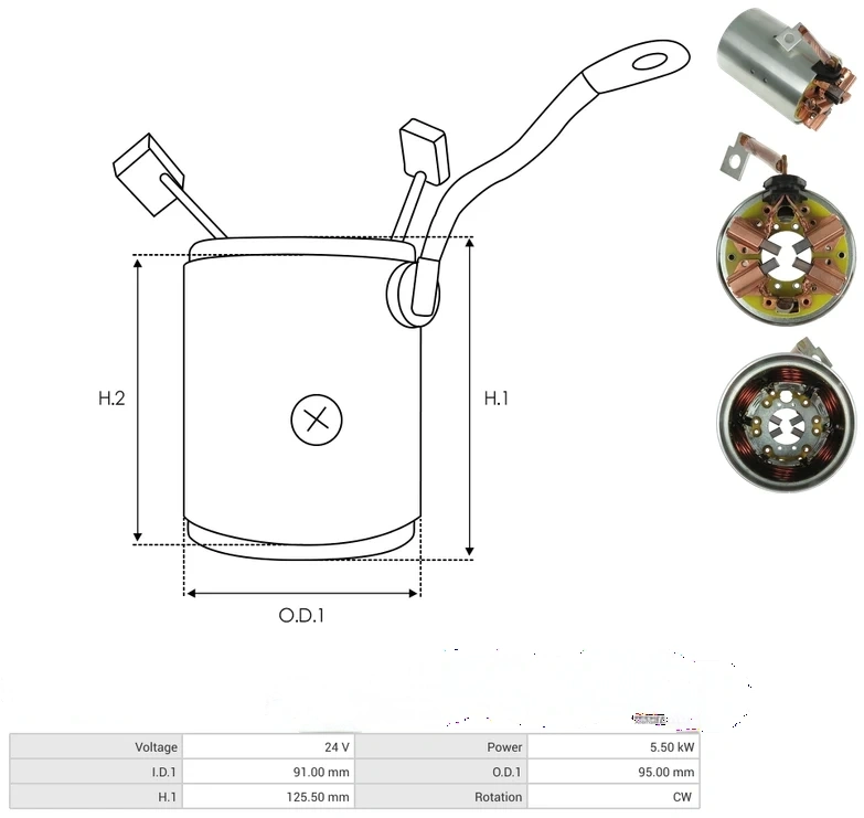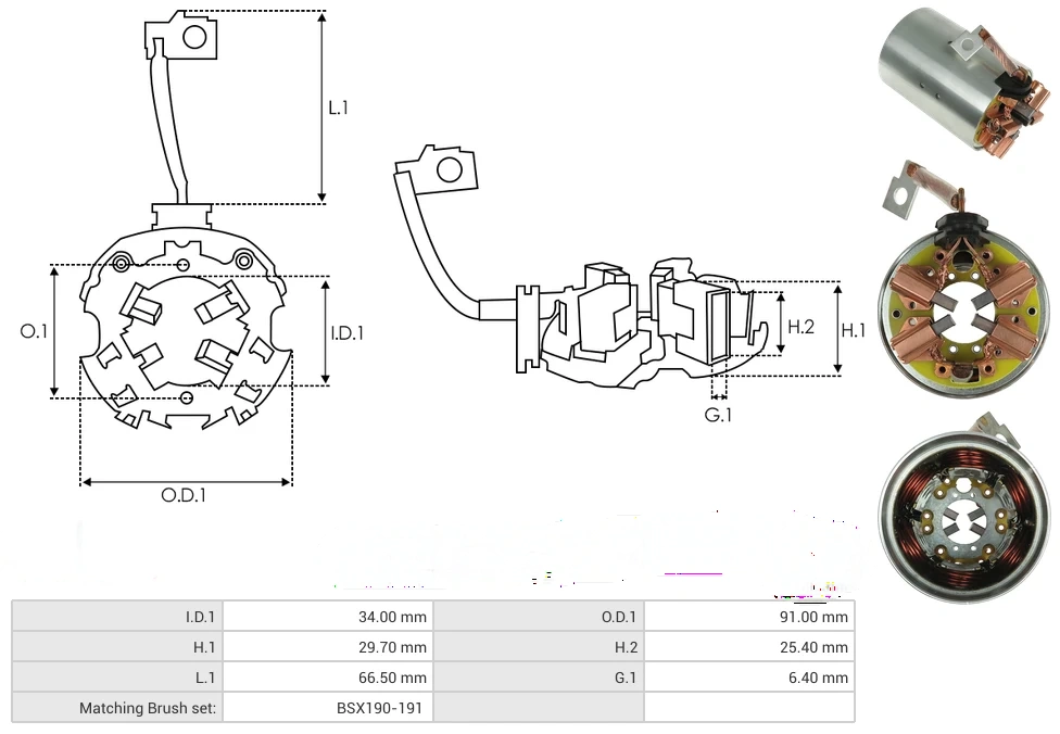 Starter brush holders I.D.1 [ mm ] 34.00 O.D.1 [ mm ] 91.00 H.1 [ mm ] 29.70 H.2 [ mm ] 25.40 L.1 [ mm ] 66.50 G.1 [ mm ] 6.40 Matching Brush set: BSX190-191 Starter yokes with field coils Voltage [ V ] 24 Power [ kW ] 5.50 I.D.1 [ mm ] 91.00 O.D.1 [ mm ] 95.00 H.1 [ mm ] 125.50 Rotation CW