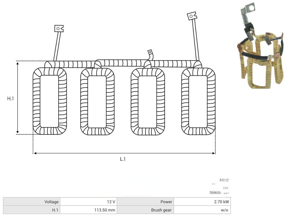 Starter field coils Voltage [ V ] 12 Power [ kW ] 2.70 H.1 [ mm ] 113.50 Brush gear: w/o