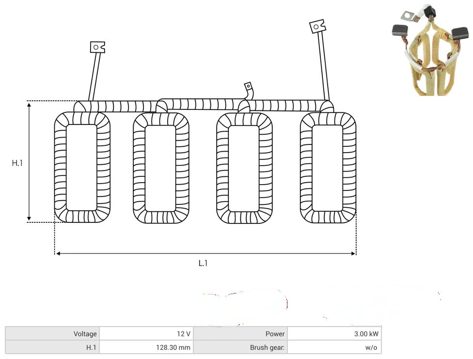 Product features : Starter field coils Voltage [ V ] 12 Power [ kW ] 3.00 H.1 [ mm ] 128.30 Brush gear: w/o