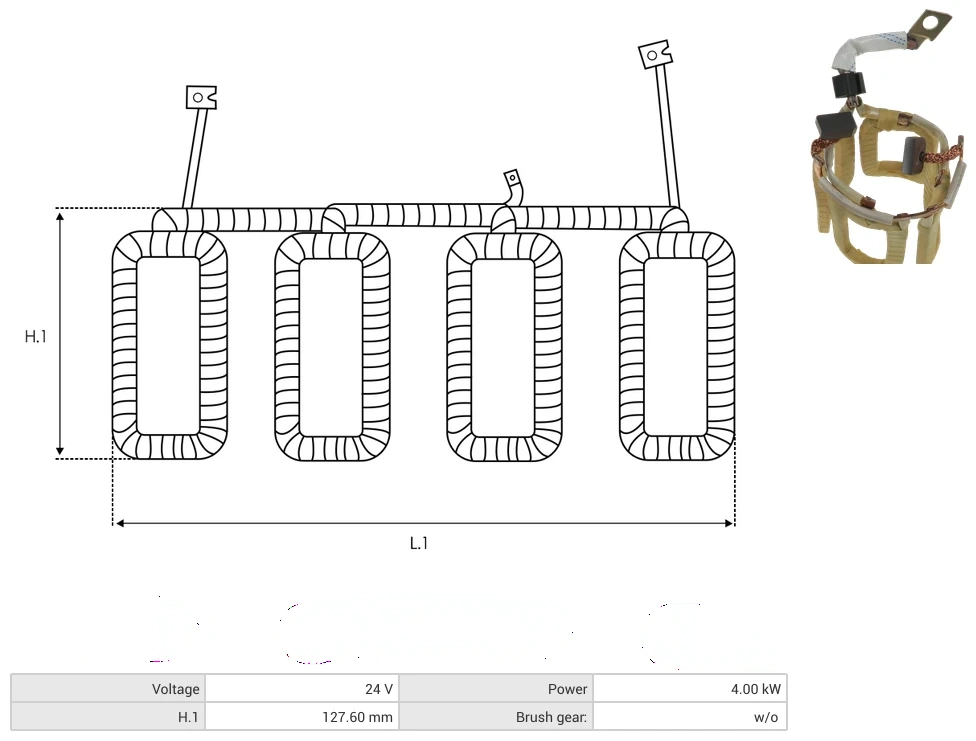 Starter field coils Voltage [ V ] 24 Power [ kW ] 4.00 H.1 [ mm ] 127.60 Brush gear: w/o