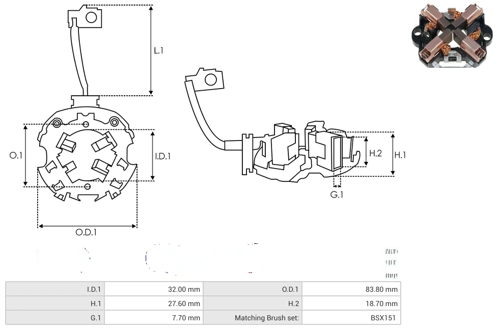 Starter brush holders I.D.1 [ mm ] 32.00 O.D.1 [ mm ] 83.80 H.1 [ mm ] 27.60 H.2 [ mm ] 18.70 G.1 [ mm ] 7.70