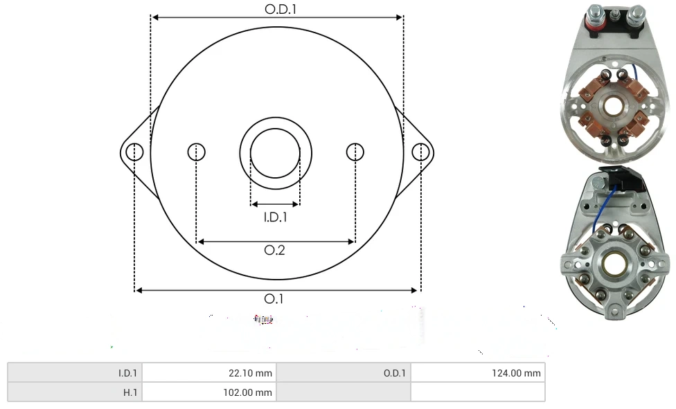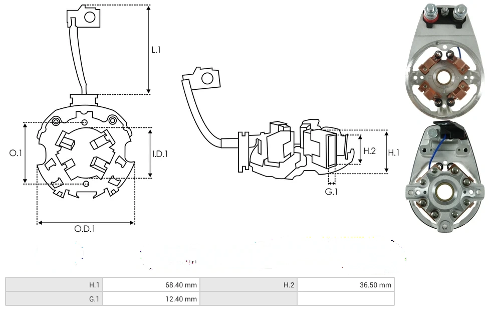 Starter c.e. brackets I.D.1 [ mm ] 22.10 O.D.1 [ mm ] 124.00 H.1 [ mm ] 102.00 Starter brush holders H.1 [ mm ] 68.40 H.2 [ mm ] 36.50 G.1 [ mm ] 12.40
