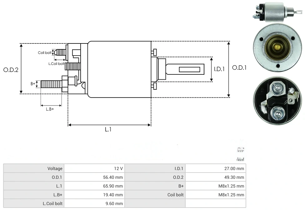 Starter solenoids Voltage [ V ] 12 I.D.1 [ mm ] 27.00 O.D.1 [ mm ] 56.40 O.D.2 [ mm ] 49.30 L.1 [ mm ] 65.90 B+ [ mm ] M8x1.25 L.B+ [ mm ] 19.40 Coil bolt [ mm ] M8x1.25 L.Coil bolt [ mm ] 9.60