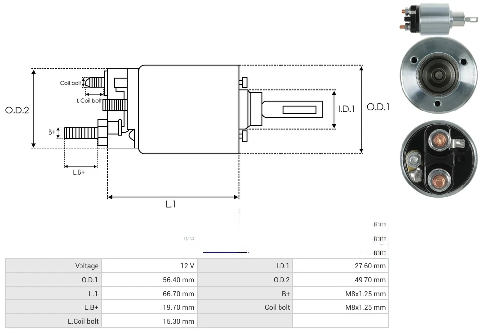 Starter solenoids Voltage [ V ] 12 I.D.1 [ mm ] 27.60 O.D.1 [ mm ] 56.40 O.D.2 [ mm ] 49.70 L.1 [ mm ] 66.70 B+ [ mm ] M8x1.25 L.B+ [ mm ] 19.70 Coil bolt [ mm ] M8x1.25 L.Coil bolt [ mm ] 15.30