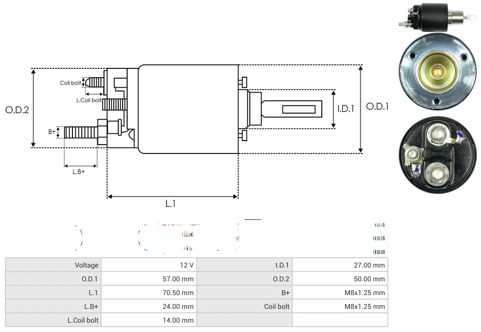 Starter solenoids Voltage [ V ] 12 I.D.1 [ mm ] 27.00 O.D.1 [ mm ] 57.00 O.D.2 [ mm ] 50.00 L.1 [ mm ] 70.50 B+ [ mm ] M8x1.25 L.B+ [ mm ] 24.00 Coil bolt [ mm ] M8x1.25 L.Coil bolt [ mm ] 14.00