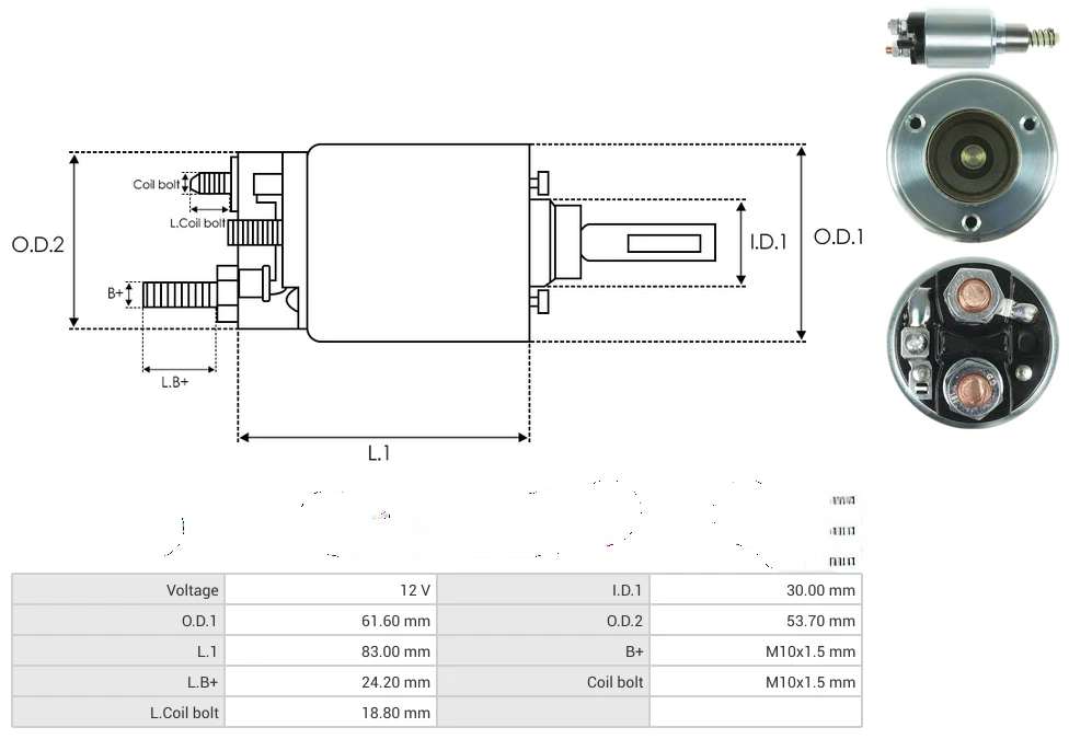 Starter solenoids Voltage [ V ] 12 I.D.1 [ mm ] 30.00 O.D.1 [ mm ] 61.60 O.D.2 [ mm ] 53.70 L.1 [ mm ] 83.00 B+ [ mm ] M10x1.5 L.B+ [ mm ] 24.20 Coil bolt [ mm ] M10x1.5 L.Coil bolt [ mm ] 18.80