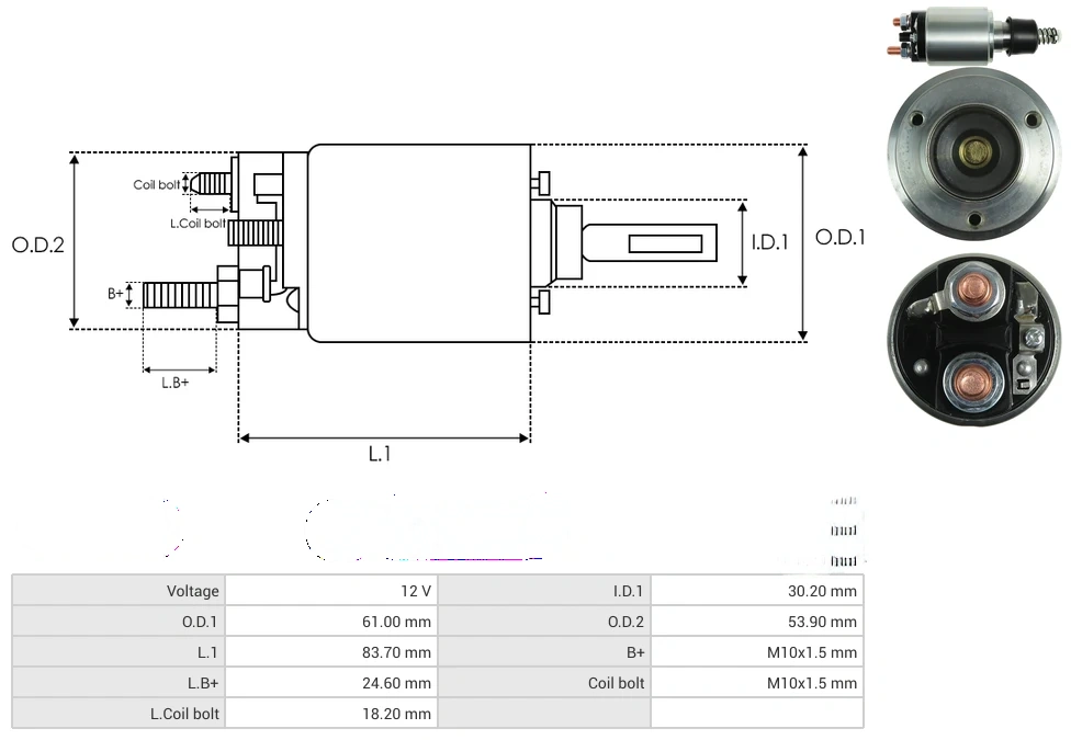 Starter solenoids Voltage [ V ] 12 I.D.1 [ mm ] 30.20 O.D.1 [ mm ] 61.00 O.D.2 [ mm ] 53.90 L.1 [ mm ] 83.70 B+ [ mm ] M10x1.5 L.B+ [ mm ] 24.60 Coil bolt [ mm ] M10x1.5 L.Coil bolt [ mm ] 18.20