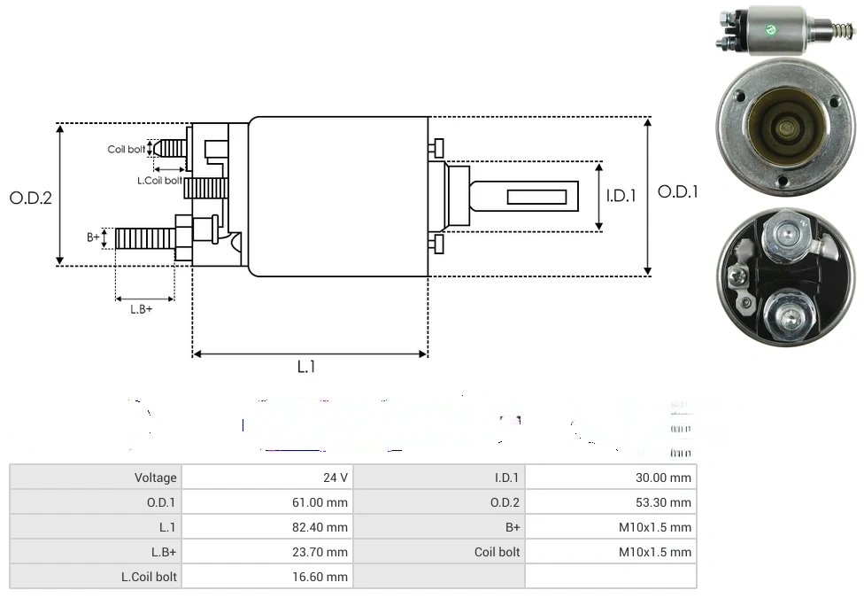 Starter solenoids Voltage [ V ] 24 I.D.1 [ mm ] 30.00 O.D.1 [ mm ] 61.00 O.D.2 [ mm ] 53.30 L.1 [ mm ] 82.40 B+ [ mm ] M10x1.5 L.B+ [ mm ] 23.70 Coil bolt [ mm ] M10x1.5 L.Coil bolt [ mm ] 16.60