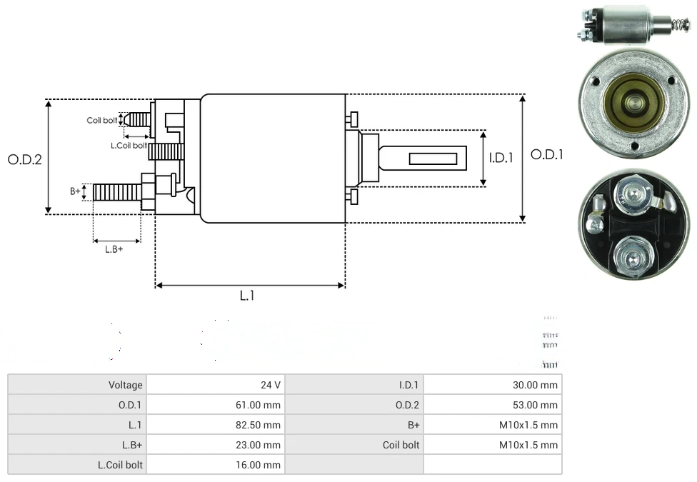 Starter solenoids Voltage [ V ] 24 I.D.1 [ mm ] 30.00 O.D.1 [ mm ] 61.00 O.D.2 [ mm ] 53.00 L.1 [ mm ] 82.50 B+ [ mm ] M10x1.5 L.B+ [ mm ] 23.00 Coil bolt [ mm ] M10x1.5 L.Coil bolt [ mm ] 16.00