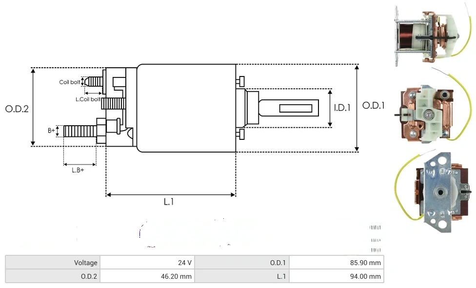 Starter solenoids Voltage [ V ] 24 O.D.1 [ mm ] 85.90 O.D.2 [ mm ] 46.20 L.1 [ mm ] 94.00