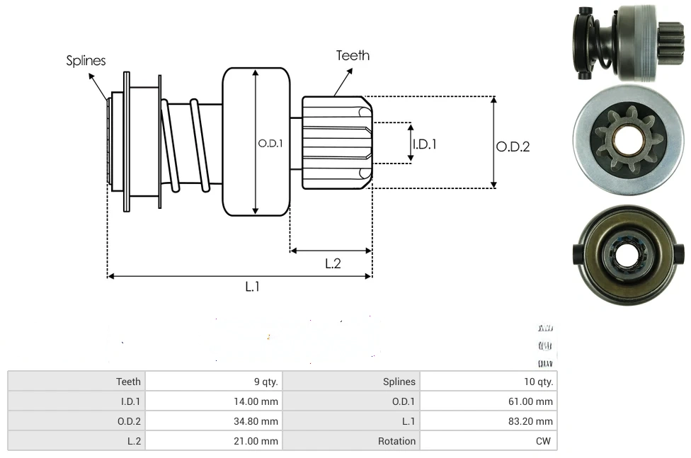 Starter drives Teeth [ qty. ] 9 Splines [ qty. ] 10 I.D.1 [ mm ] 14.00 O.D.1 [ mm ] 61.00 O.D.2 [ mm ] 34.80 L.1 [ mm ] 83.20 L.2 [ mm ] 21.00 Rotation CW