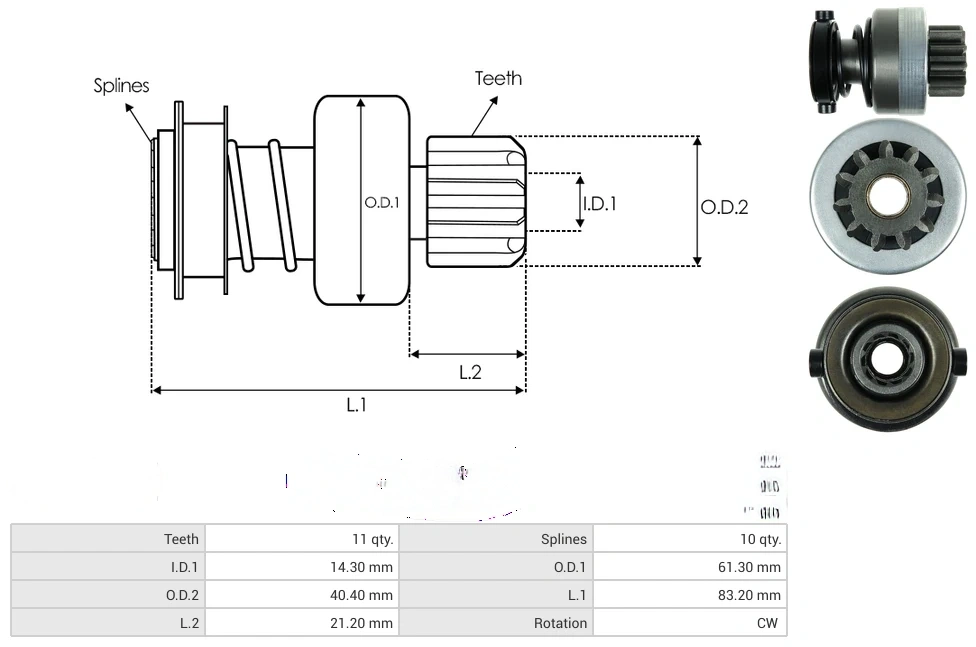 Starter drives Teeth [ qty. ] 11 Splines [ qty. ] 10 I.D.1 [ mm ] 14.30 O.D.1 [ mm ] 61.30 O.D.2 [ mm ] 40.40 L.1 [ mm ] 83.20 L.2 [ mm ] 21.20 Rotation CW