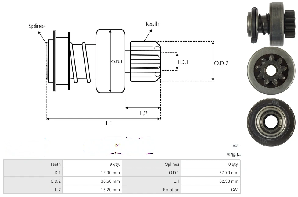 Starter drives Teeth [ qty. ] 9 Splines [ qty. ] 10 I.D.1 [ mm ] 12.00 O.D.1 [ mm ] 57.70 O.D.2 [ mm ] 36.60 L.1 [ mm ] 62.30 L.2 [ mm ] 15.20 Rotation CW