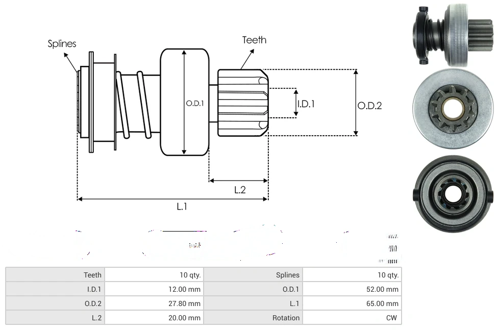 Starter drives Teeth [ qty. ] 10 Splines [ qty. ] 10 I.D.1 [ mm ] 12.00 O.D.1 [ mm ] 52.00 O.D.2 [ mm ] 27.80 L.1 [ mm ] 65.00 L.2 [ mm ] 20.00 Rotation CW
