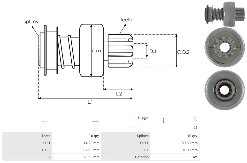 Starter drives Teeth [ qty. ] 10 Splines [ qty. ] 10 I.D.1 [ mm ] 14.20 O.D.1 [ mm ] 59.80 O.D.2 [ mm ] 32.00 L.1 [ mm ] 91.00 L.2 [ mm ] 23.50 Rotation CW