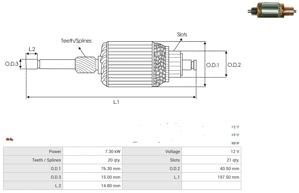 Starter armatures Power [ kW ] 7.30 Voltage [ V ] 12 Teeth / Splines [ qty. ] 20 Slots [ qty. ] 21 O.D.1 [ mm ] 76.30 O.D.2 [ mm ] 40.50 O.D.3 [ mm ] 15.00 L.1 [ mm ] 197.50 L.2 [ mm ] 14.80