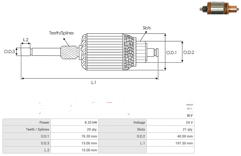 Starter armatures Power [ kW ] 8.20 Voltage [ V ] 24 Teeth / Splines [ qty. ] 20 Slots [ qty. ] 21 O.D.1 [ mm ] 76.30 O.D.2 [ mm ] 40.00 O.D.3 [ mm ] 15.00 L.1 [ mm ] 197.30 L.2 [ mm ] 15.00