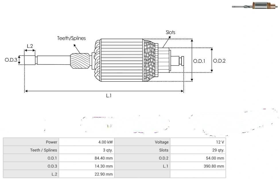 Starter armatures Power [ kW ] 4.00 Voltage [ V ] 12 Teeth / Splines [ qty. ] 3 Slots [ qty. ] 29 O.D.1 [ mm ] 84.40 O.D.2 [ mm ] 54.00 O.D.3 [ mm ] 14.30 L.1 [ mm ] 390.80 L.2 [ mm ] 22.90