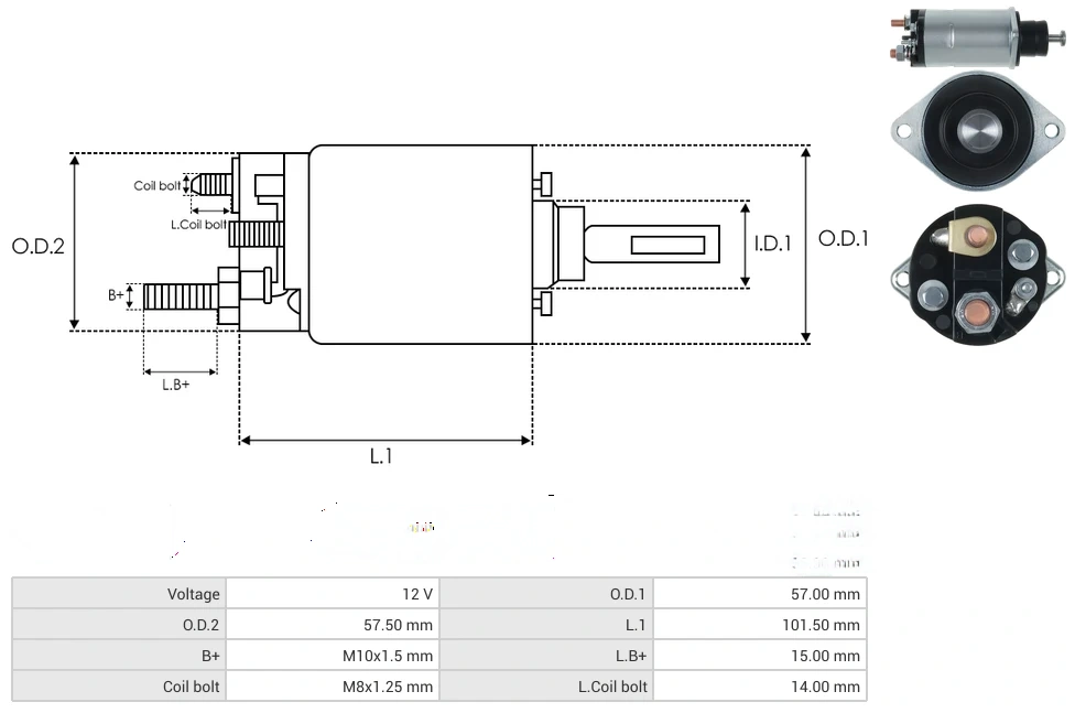 Starter solenoids Voltage [ V ] 12 O.D.1 [ mm ] 57.00 O.D.2 [ mm ] 57.50 L.1 [ mm ] 101.50 B+ [ mm ] M10x1.5 L.B+ [ mm ] 15.00 Coil bolt [ mm ] M8x1.25 L.Coil bolt [ mm ] 14.00